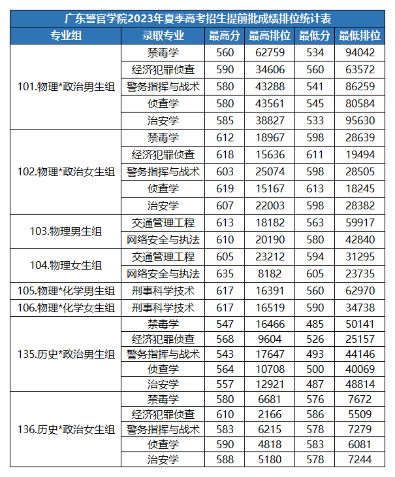 今年广东警官学院在历史+政治男生组中招生的禁毒学专业最低收分为485分,全省最低排名在50000名以内均有机会被录取;同样是在该选科组内,学校的警务指挥与战术、治安学等公安专业最低投档分数均在500分以内,分别为493分和487分;而较为热门的侦查学专业录取分数也刚好为500分。非常推荐成绩在中等偏上的考生报考。