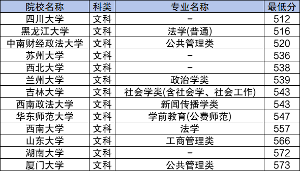 宁夏高校专项计划文科录取分数最低的是四川大学,2024年最低分为512分;相对较低的还有黑龙江大学(法学(普通)516分)、中南财经政法大学(公共管理类520分)、苏州大学(536分)等。