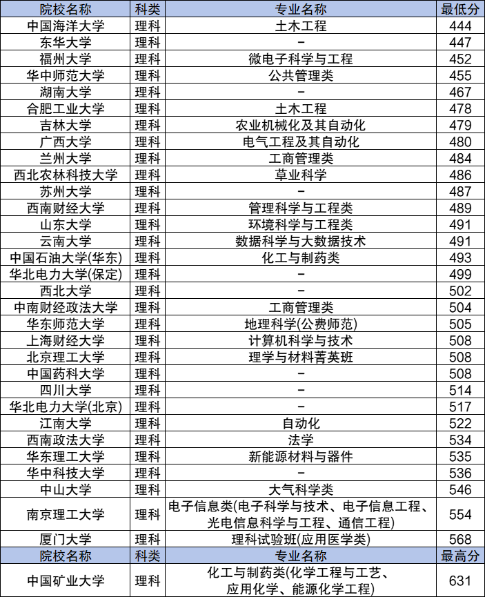 2024年各大学高校专项计划在宁夏理科的招生专业要多于文科,理科各大学高校专项计划各专业的录取分数线在444分-568分之间;录取分数最高的是厦门大学理科试验班(应用医学类),最低分为568分;录取分数最低的是中国海洋大学土木工程专业,2024最低分为444分。