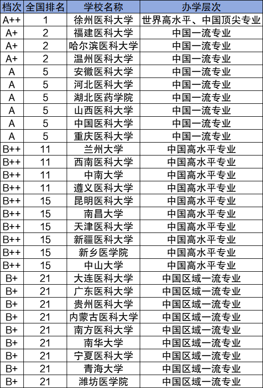在这份名单中,我们可以得知,麻醉学专业并没有50所高校入选,目前进入校友会排名的仅有29所,其中徐州医科大学是麻醉学专业中排名第一的存在,麻醉学专业获得了A++的档次,除了这所学校之外,安徽医科大学、中国医科大学、哈尔滨医科大学、福建医科大学、湖北医药学院等高校麻醉学专业都进入了A类。