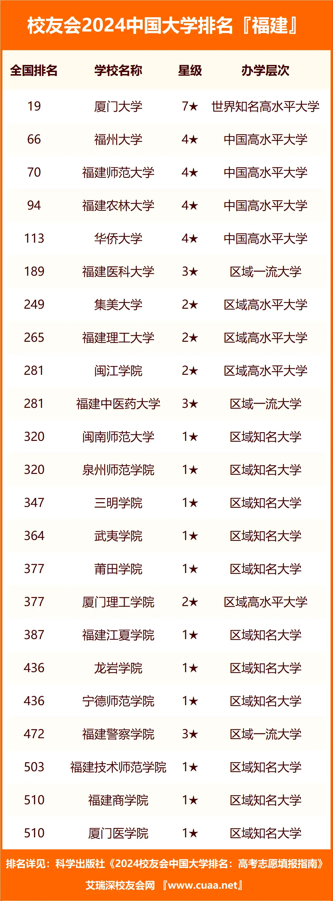 根据2024年校友会公布的中国大学排行榜来看,福建公办本科大学排名前十名的是: