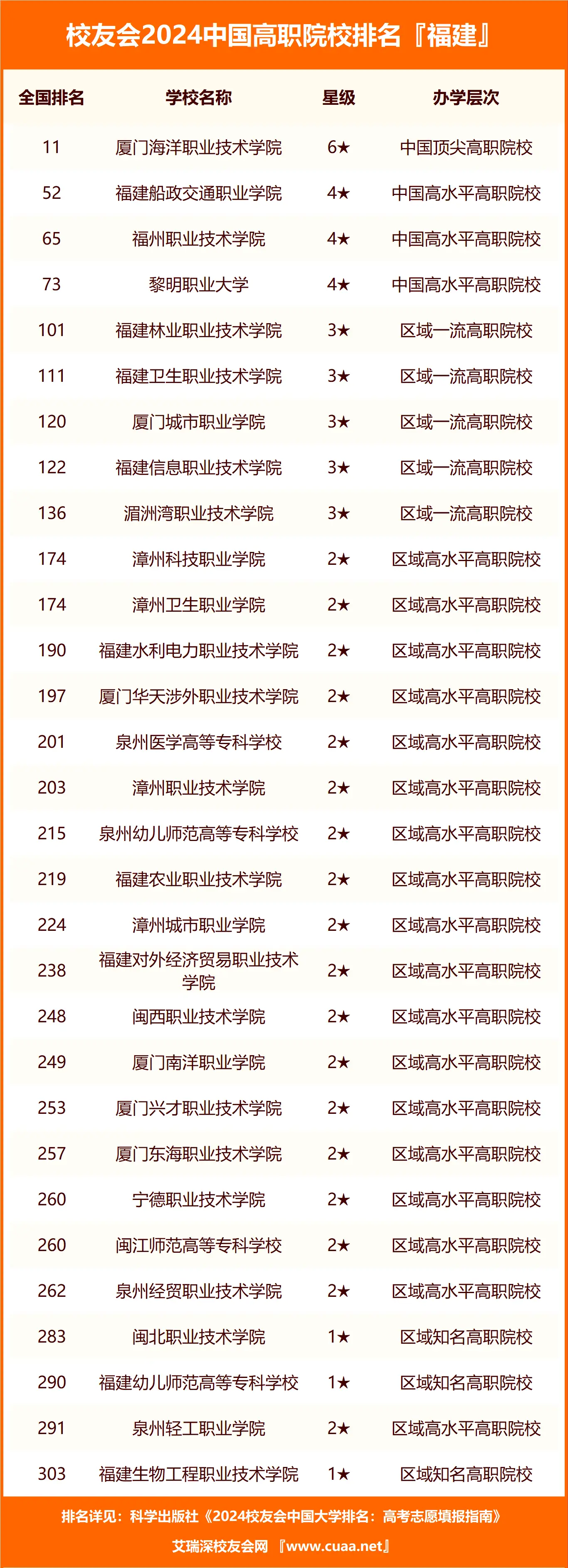 在2024年校友会公布的中国大学排名名单中,福建高职专科大学排名前十名的是: