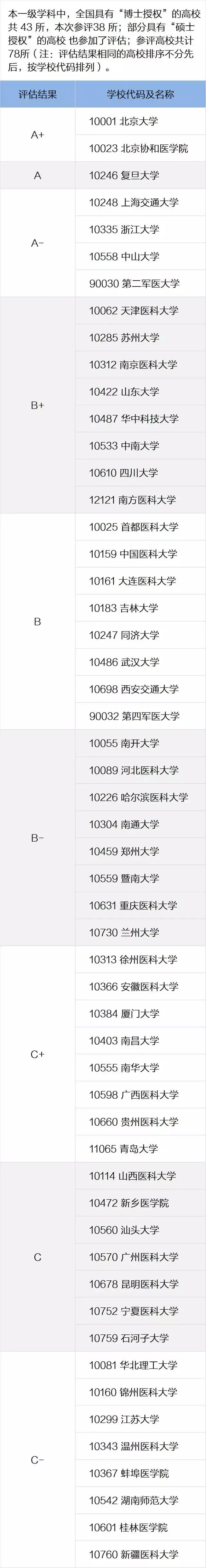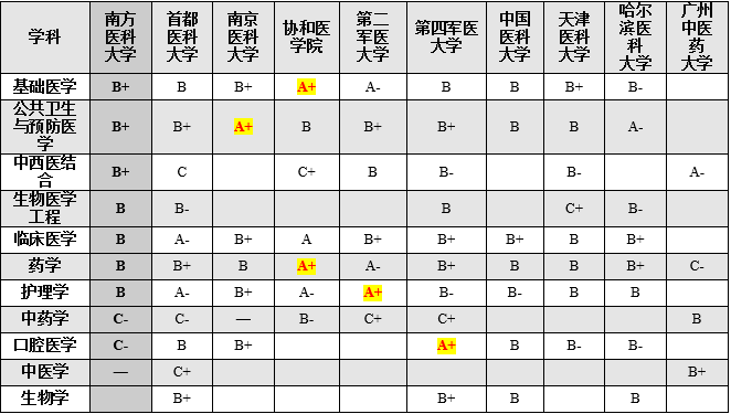 而南方医科大学对比同类医药类高校,参选学科在A+档高校有,北京协和医学院2个学科:基础医学和药学,南京医科大学1个学科:公共卫生与预防医学,第二军医大学1个学科:护理学,第四军医大学1个学科:口腔医学。
