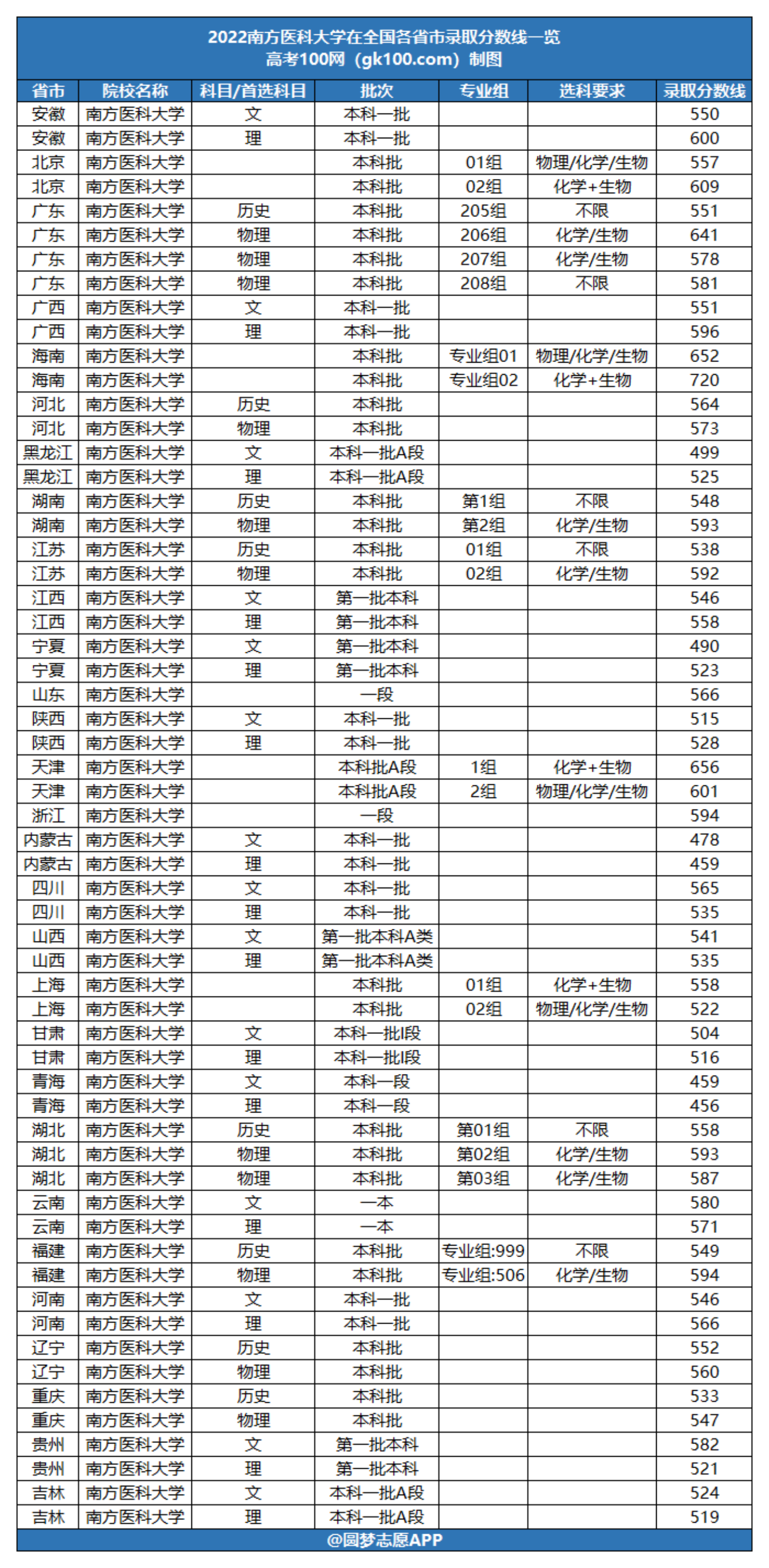 黑龙江文科,2022年南方医科录取分数线为499分;