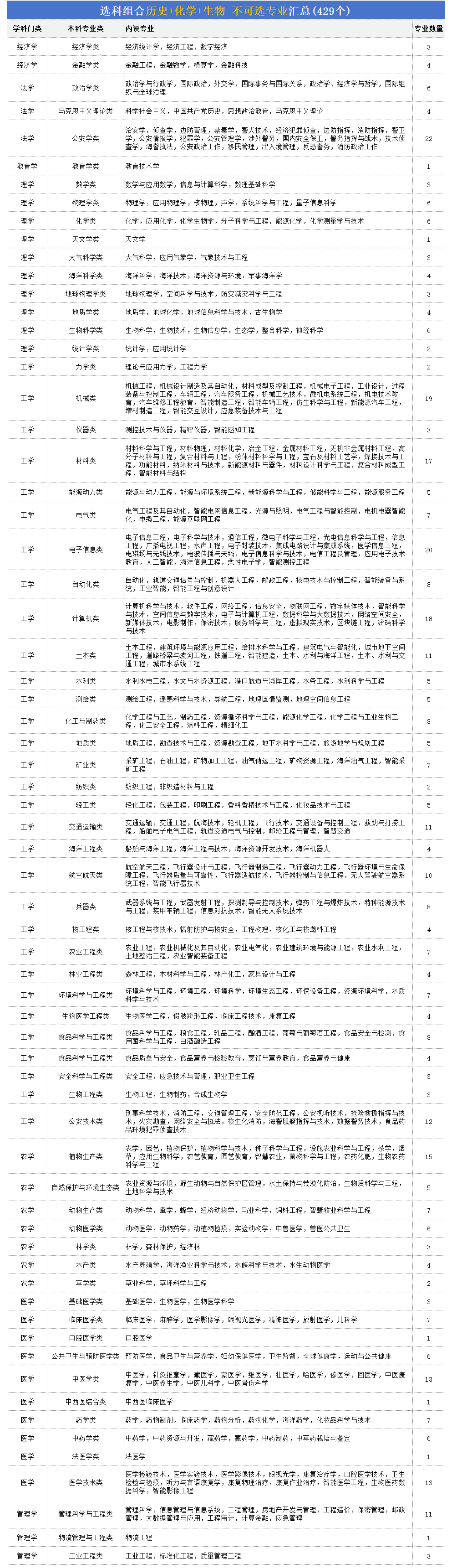 而历化生组合不可选专业共计429个,包含数学与应用数学、海洋科学、工程力学、自动化、纺织工程等,考生报考前需注意专业选科要求,避免无效报考。