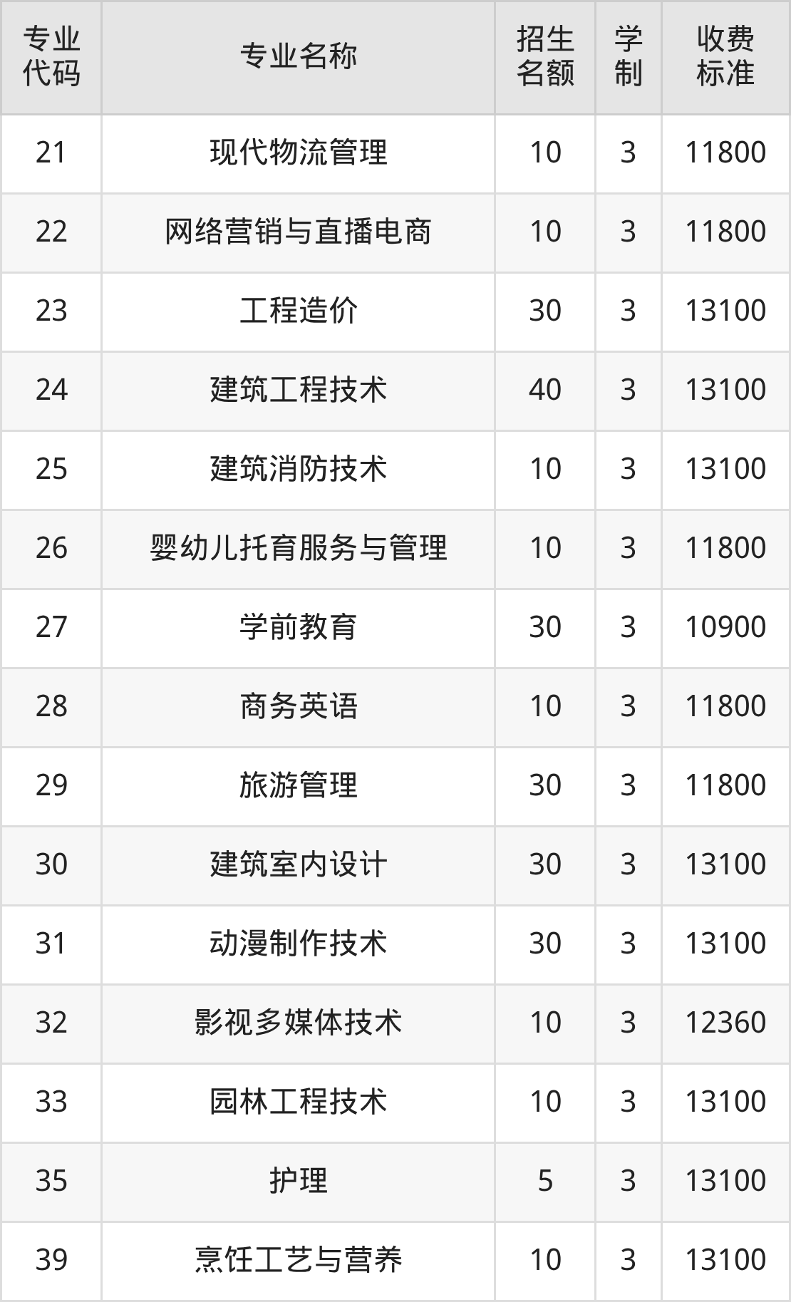 | 专业 代码 | 专业名称 | 招生 名额 | 学 制 | 收费 标准 |