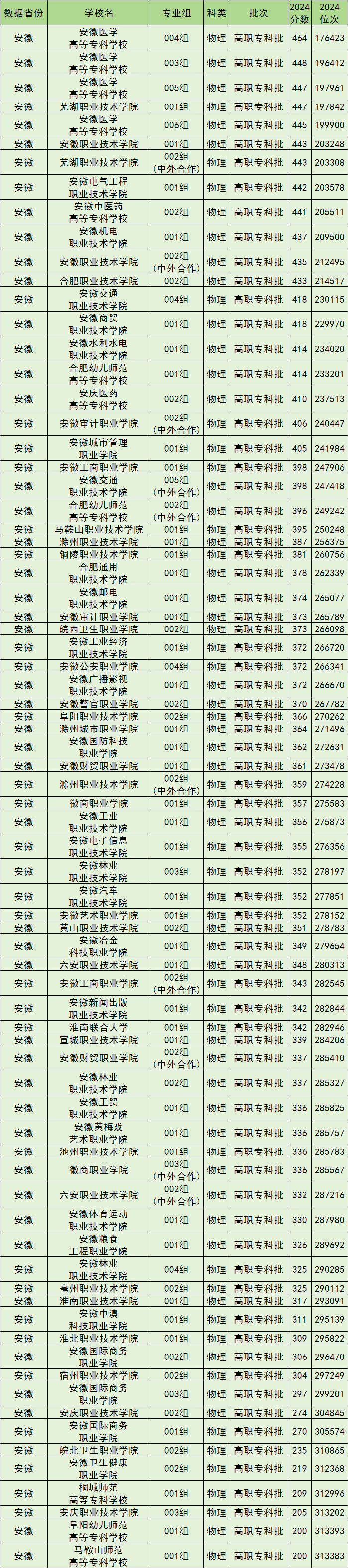 下面是2024年安徽省公办大专院校分数线排名物理类一览表: