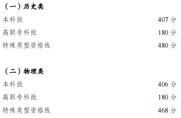 本科批分数线407分、高职专科批分数线180分、特殊类型资格线480分;