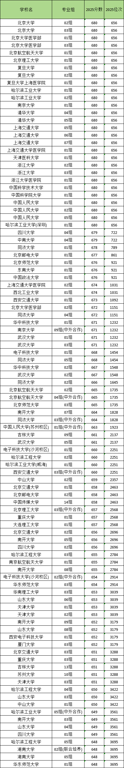 录取分数线最高的高校是北京大学,最高分专业组为02组,2025年投档最低位次在656名,对应分数在680分;排名前五的院校还包括:北京大学680分(656名、03组)、北京大学医学部680分(656名、01组)、北京大学医学部680分(656名、03组)、北京航空航天大学680分(656名、01组)。