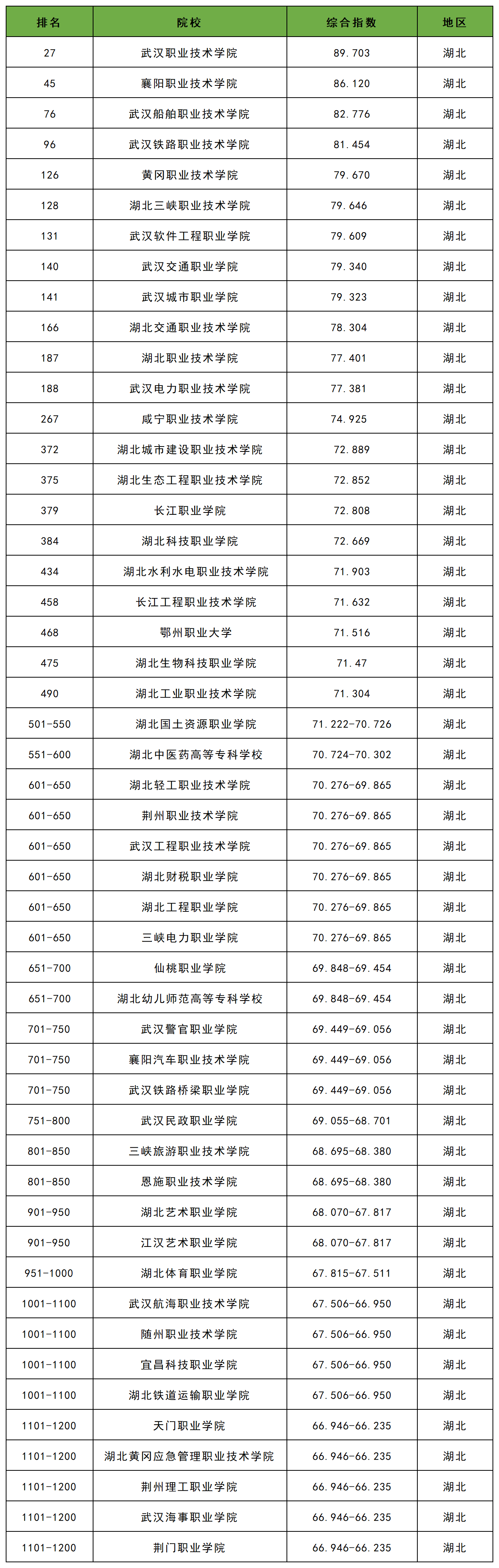 2025年GDI湖北省公办专科大学排名前十大学如下: