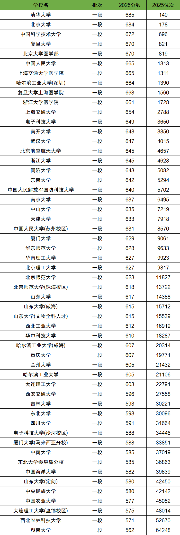 2025全国985大学录取分数线562分-685分。最高录取分数线对应院校:清华大学;最低录取分数线对应院校:湖南大学。