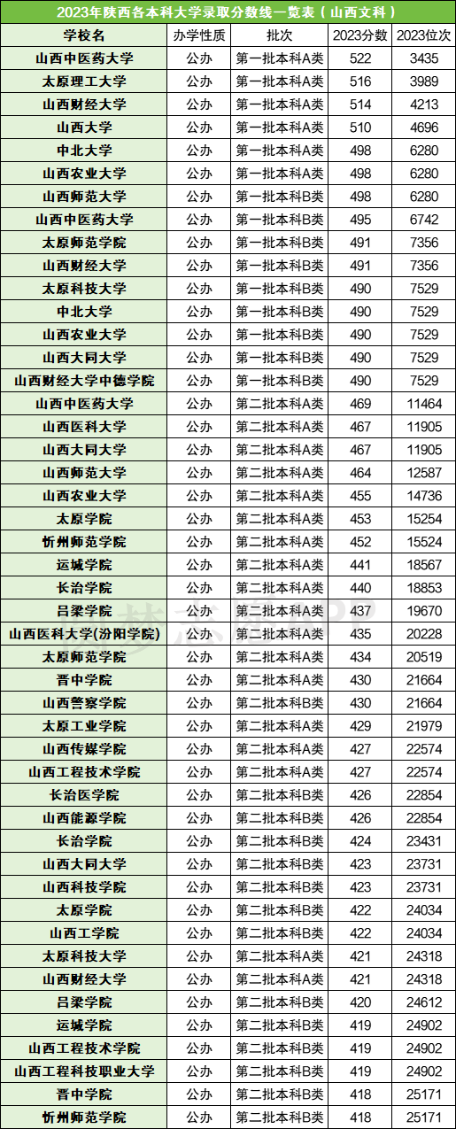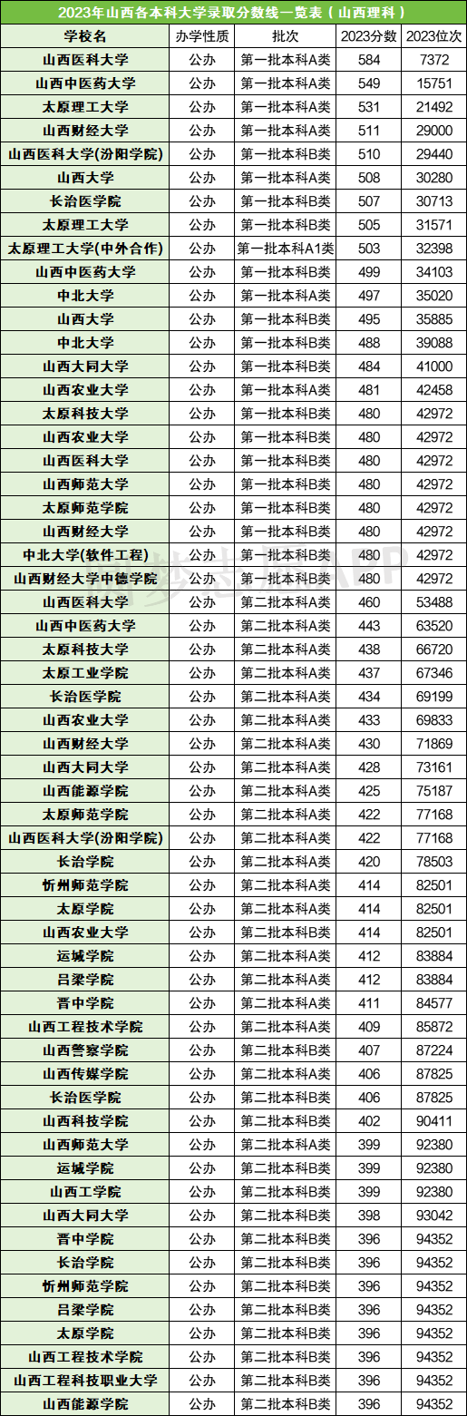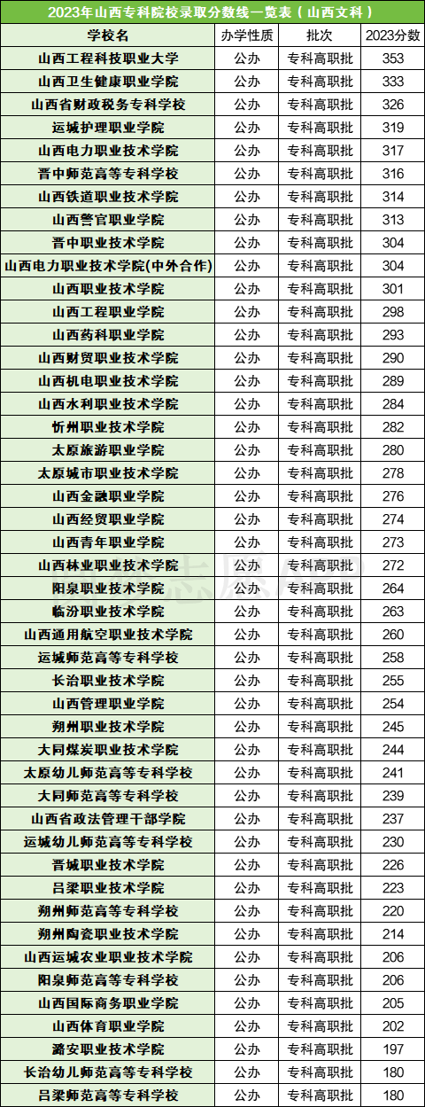 在此以山西2023年的招生数据为例,整理了山西各大学在省内本科和专科批次的录取分数线一览表,如下: