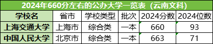 在下图中,分数刚好在660分的院校有1所,即上海交通大学,此外中国人民大学2024年录取分数线663分,这两所都属于综合类院校,文科生可以选择的专业较多。
