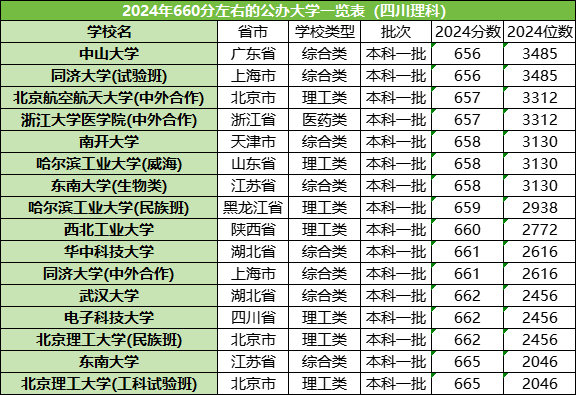 以四川2024年的招生数据为例,在理科方面,660分左右的院校有西北工业大学、华中科技大学、同济大学(中外合作)、武汉大学、电子科技大学、北京理工大学(民族班)、东南大学、北京理工大学(工科试验班)等。关于其余省市660分左右能上的院校,详见下文。