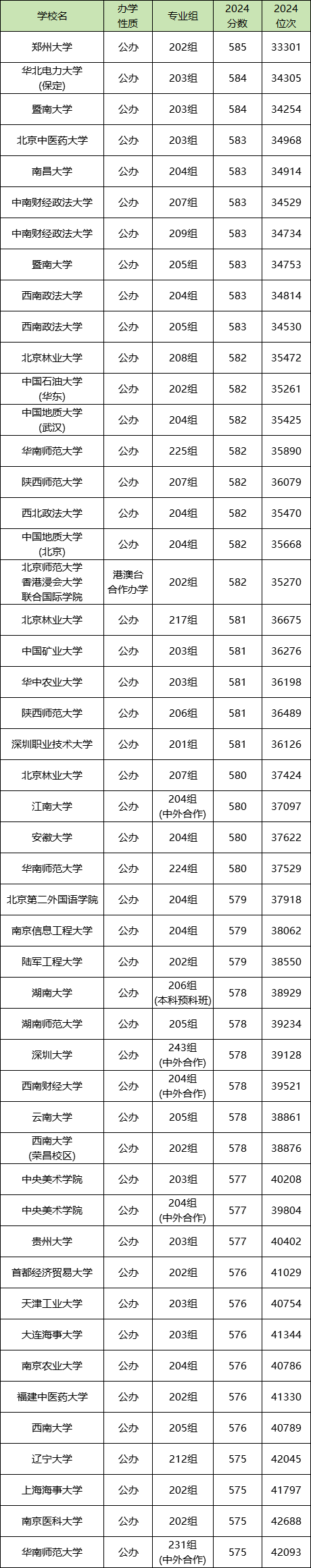 2024年广东物生地580分左右能上西南政法大学204组(583分)、西北政法大学204组(582分)、北京第二外国语学院204组(579分)等院校专业组。