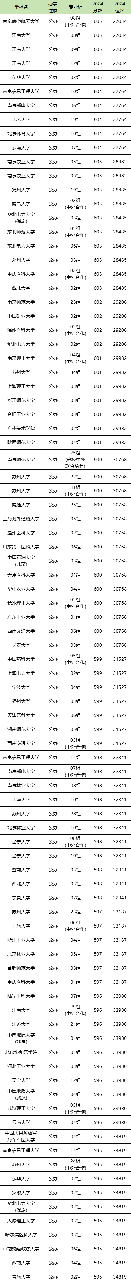 2024年江苏物化生600分左右能上南京信息工程大学10组(604分)、南通大学25组(600分)、哈尔滨医科大学03组(595分)等院校专业组。