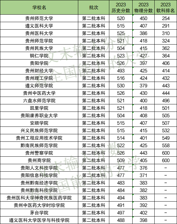 下表为贵州省所有二本学校分数线及全国排名。