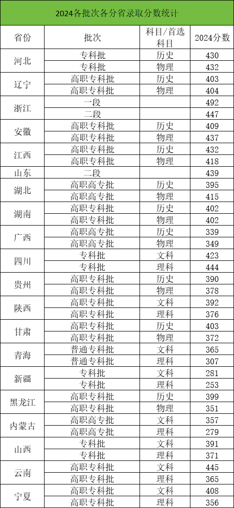 2024年吉林铁道职业技术学院专科批招生,各省最低录取分数线如下: