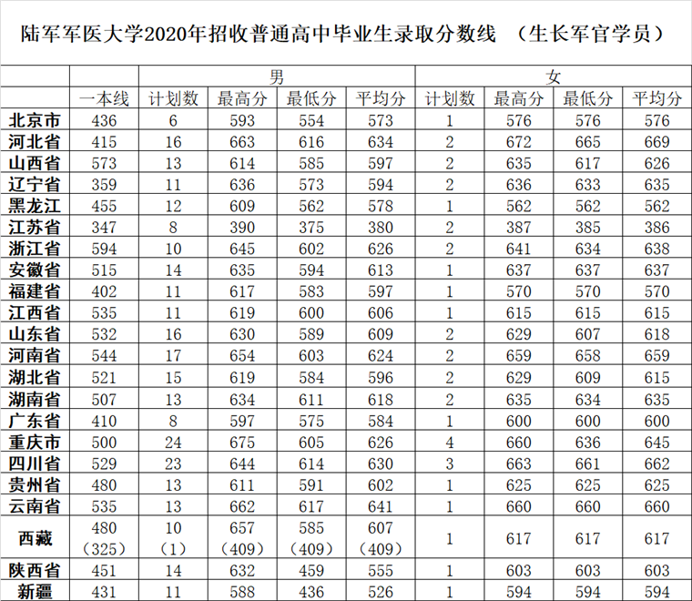 9、陆军军医大学(重庆):2020年男生最低分为新疆436分、女生最低分为福建570分。