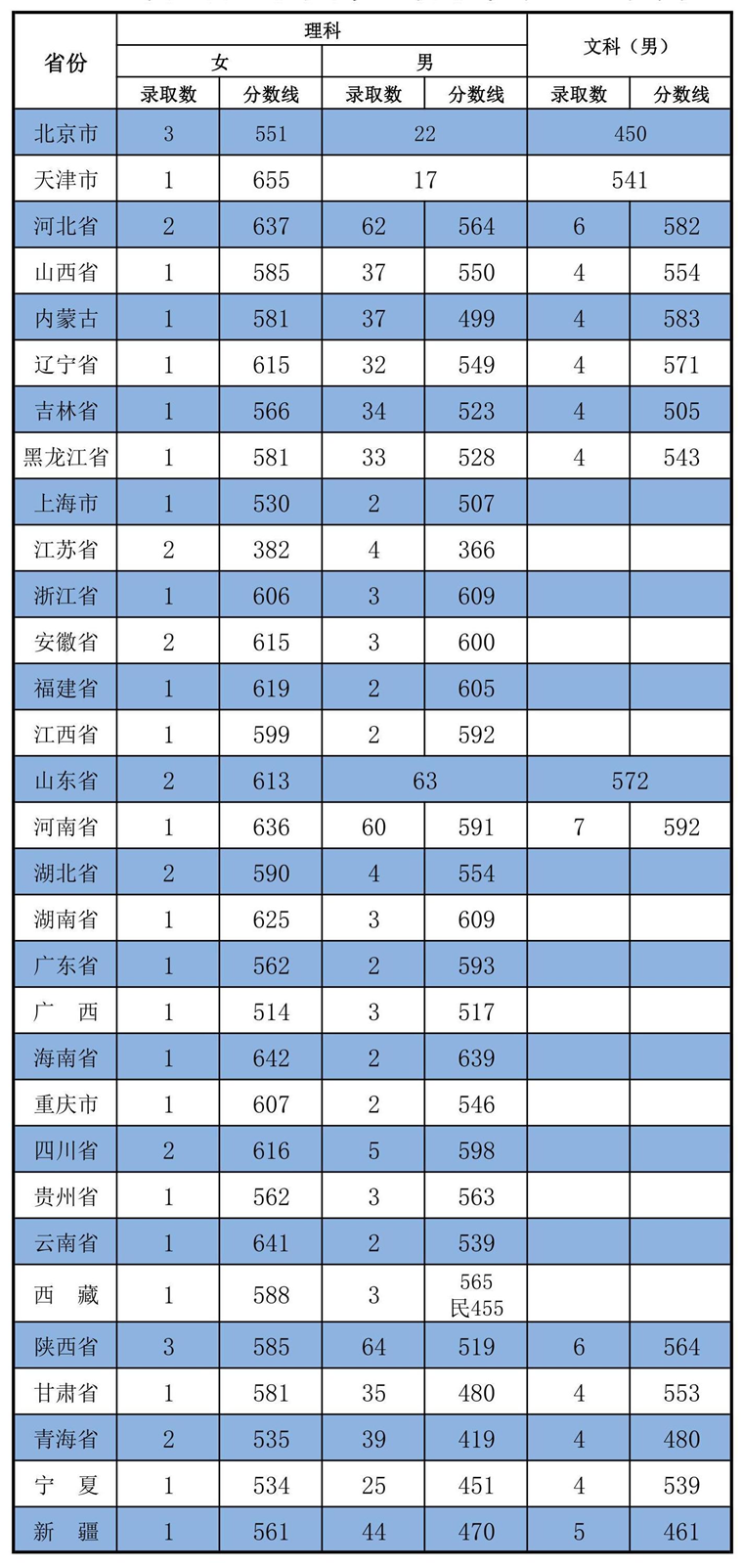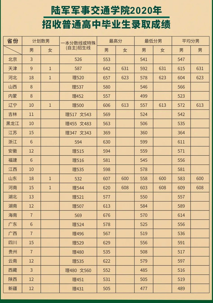 11、陆军军事交通学院(天津):2020年男生最低分为新疆477分、女生最低分为山东600分