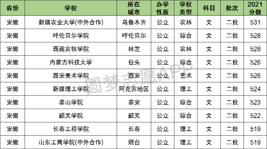 安徽刚过二本线的公办学校文科:新疆农业大学(中外合作)、呼伦贝尔学院、西藏农牧学院、内蒙古科技大学、西安美术学院、新疆理工学院、泰山学院、韶关学院、长春工程学院、山东工商学院(中外合作)。