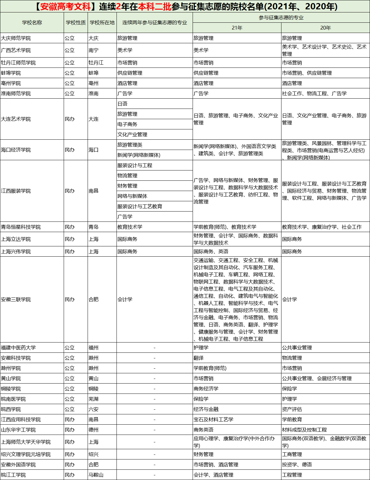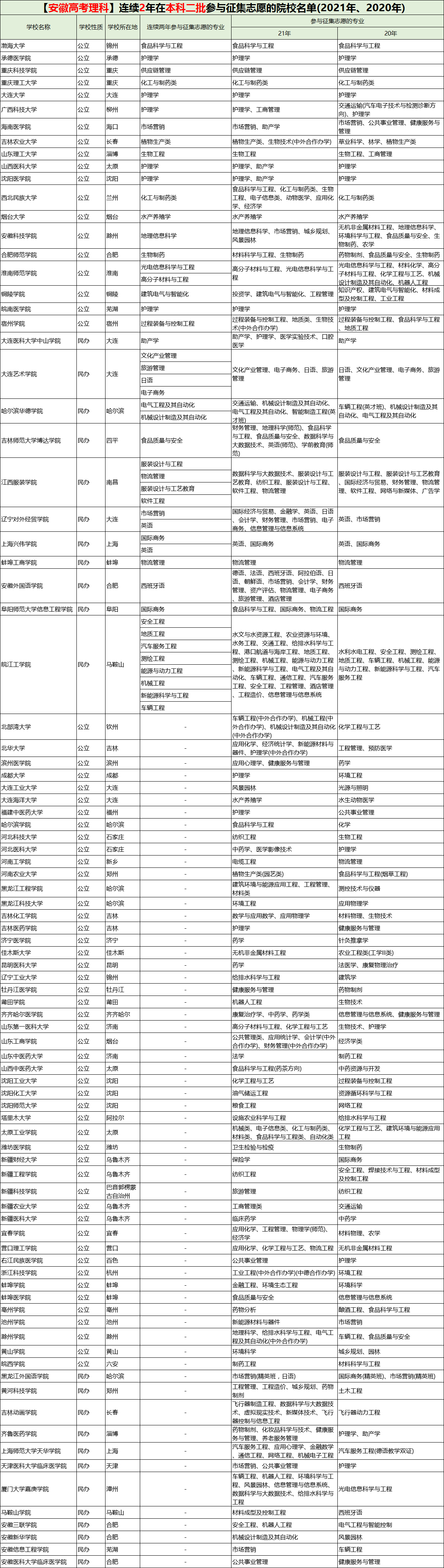 根据圆梦志愿APP的高价值数据可知,2021年、2020年安徽省连续两年都参加征集志愿的学校如下: