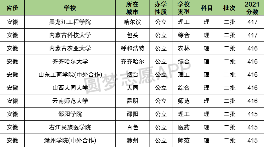 安徽刚过二本线的公办学校理科:黑龙江工程学院、内蒙古科技大学、内蒙古农业大学、齐齐哈尔大学、山东工商学院(中外合作)、山西大同大学、云南师范大学、邵阳学院、右江民族医学院、滁州学院(中外合作)。