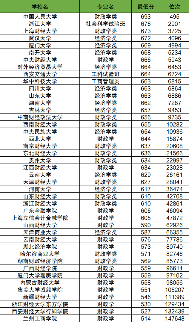 招生专业为财政学类,最低录取分数为693分,全省最低位次为495