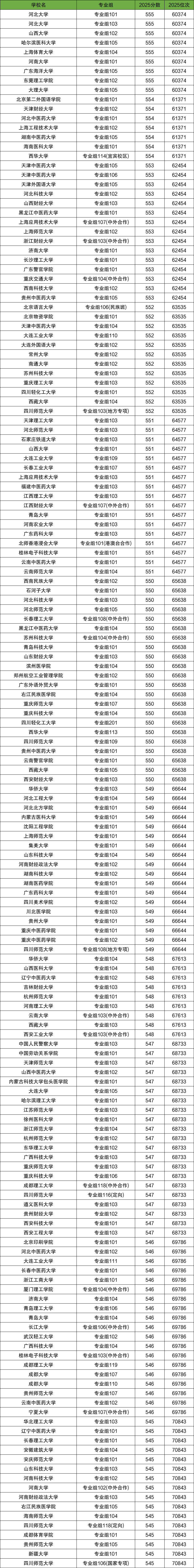 分数在545分的院校有18所,分别是长春工业大学、广东药科大学、广西师范大学、河北大学、华东交通大学等。