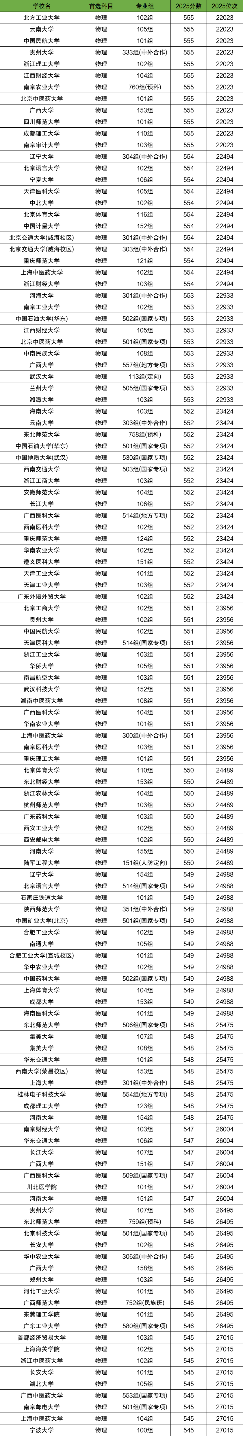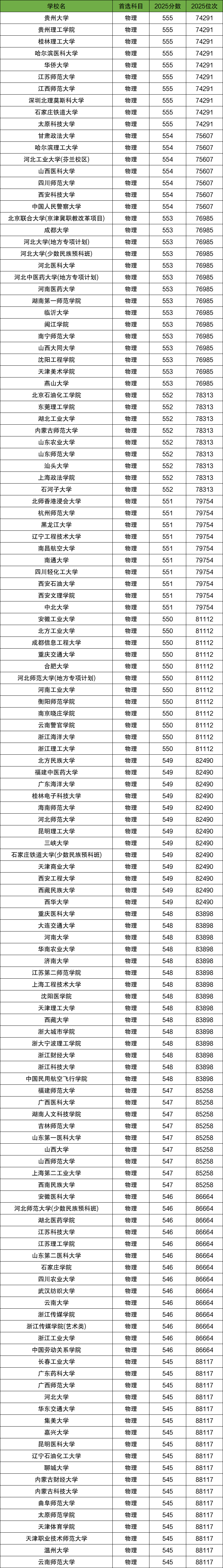 以四川2025年物理类的招生数据为例,550分左右可以上的院校有河北大学、山西大学、哈尔滨医科大学、上海体育大学、河南大学、广东海洋大学、东莞理工学院、长沙理工大学等。