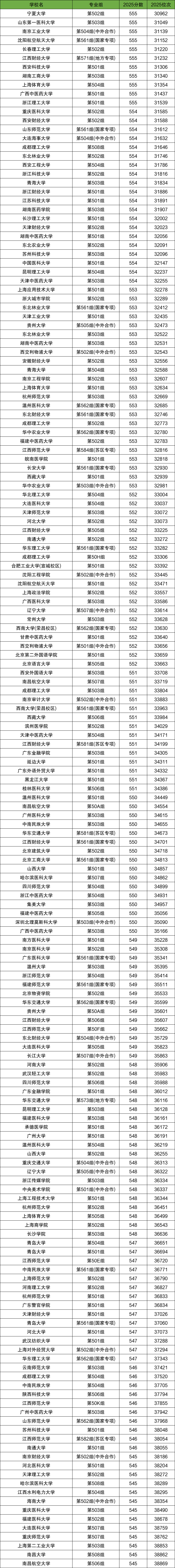 分数在545分的院校专业组有13个,分别是南京财经大学、河北医科大学、天津理工大学、哈尔滨医科大学等。