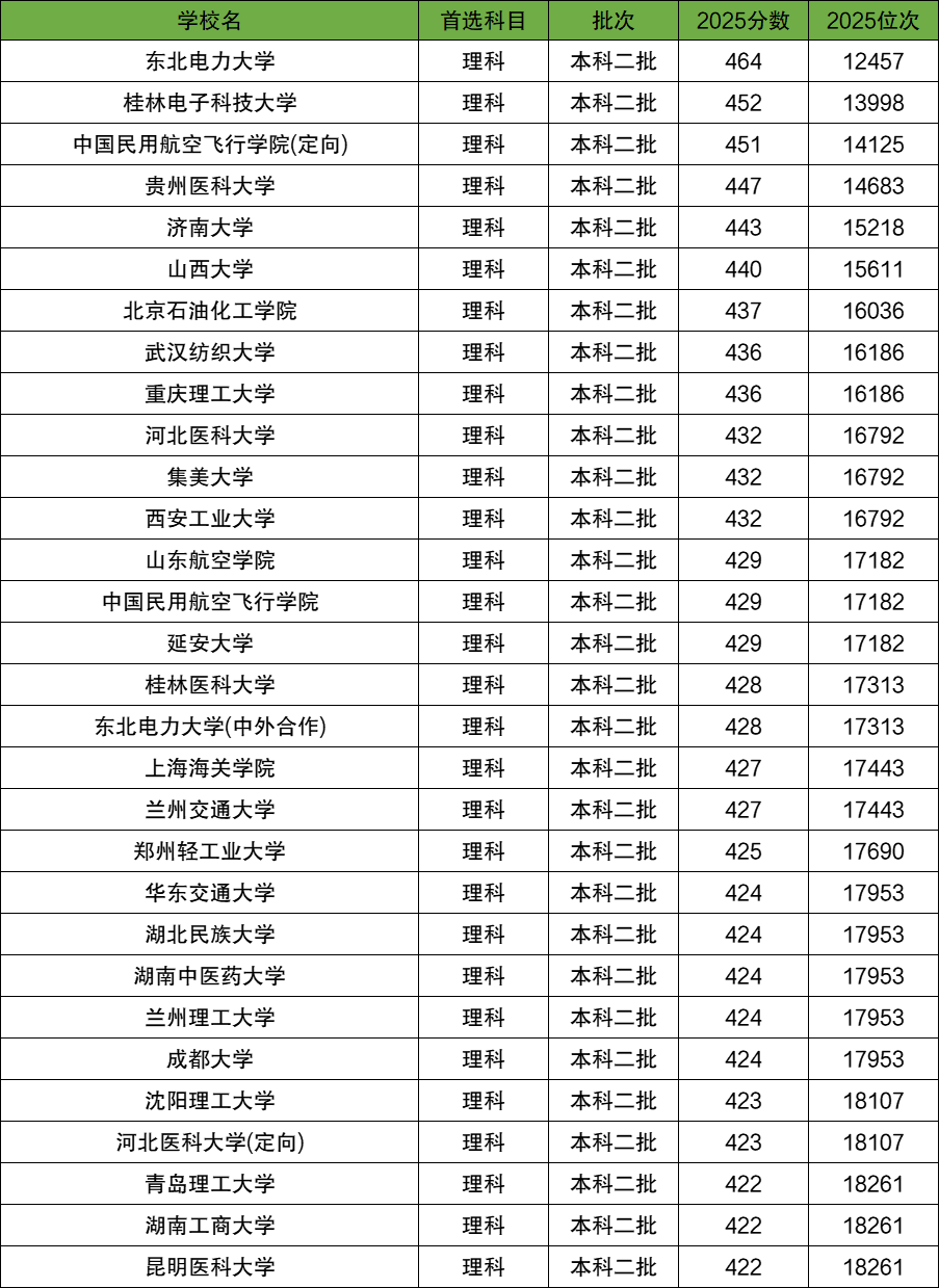 再来看新疆理科的情况,新疆理科分数线前三的二本大学是东北电力大学、桂林电子科技大学、中国民用航空飞行学院(定向),录取分数均在450分以上