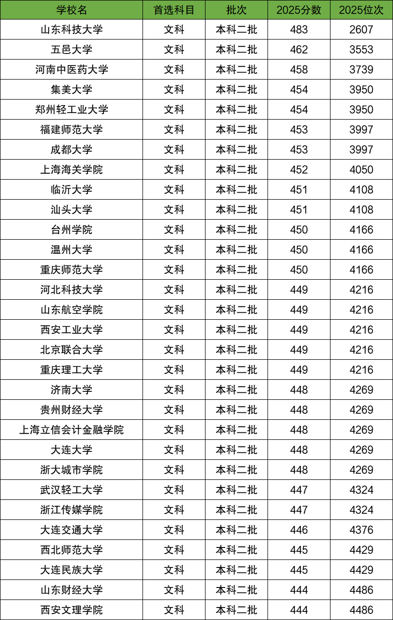 根据2025年全国二本大学在新疆文科的录取情况,二本大学录取分数线排名为第一名483分(山东科技大学)、第二名462分(五邑大学)、第三名458分(河南中医药大学)等等,下文可以查看前30强的具体分数线。