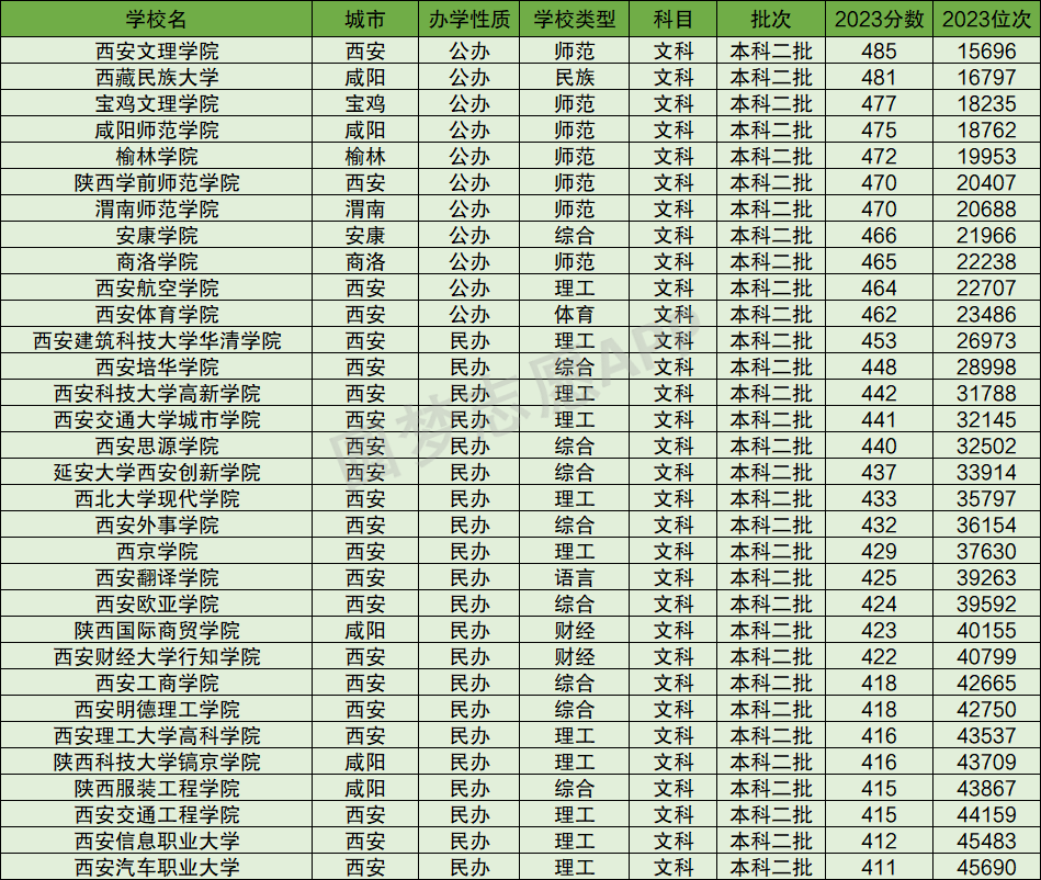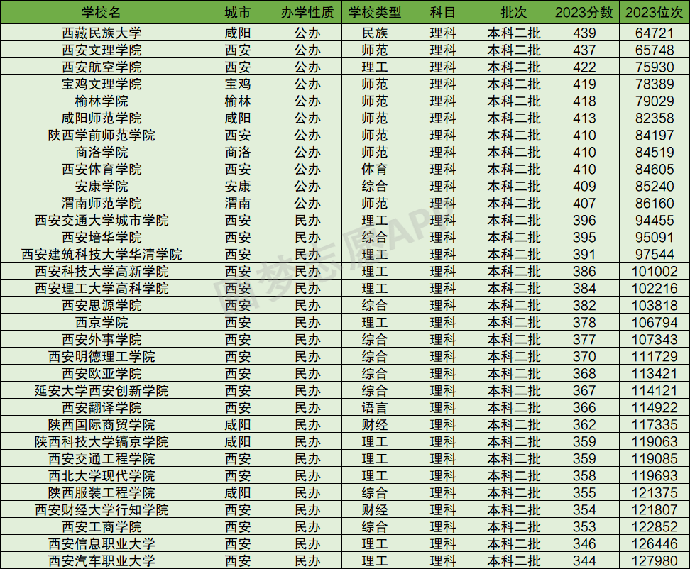 2023年陕西二本大学录取分数线最高的学校是文科西藏民族大学439分,理科西安文理学院485分。本文将介绍2024年陕西省二本大学最新排名,以及陕西所有二本大学录取分数线。