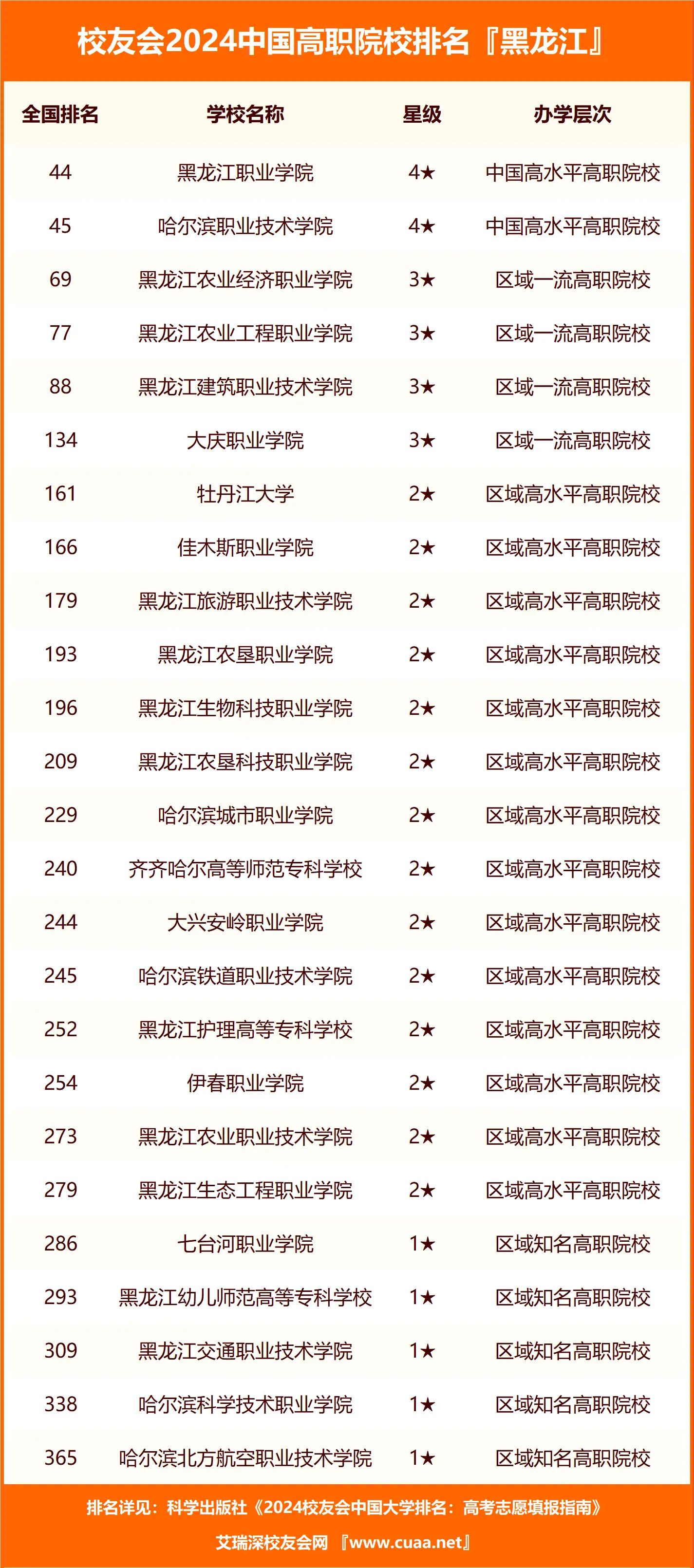 以下为中国25所黑龙江的高职专科院校最新排行榜一览表: