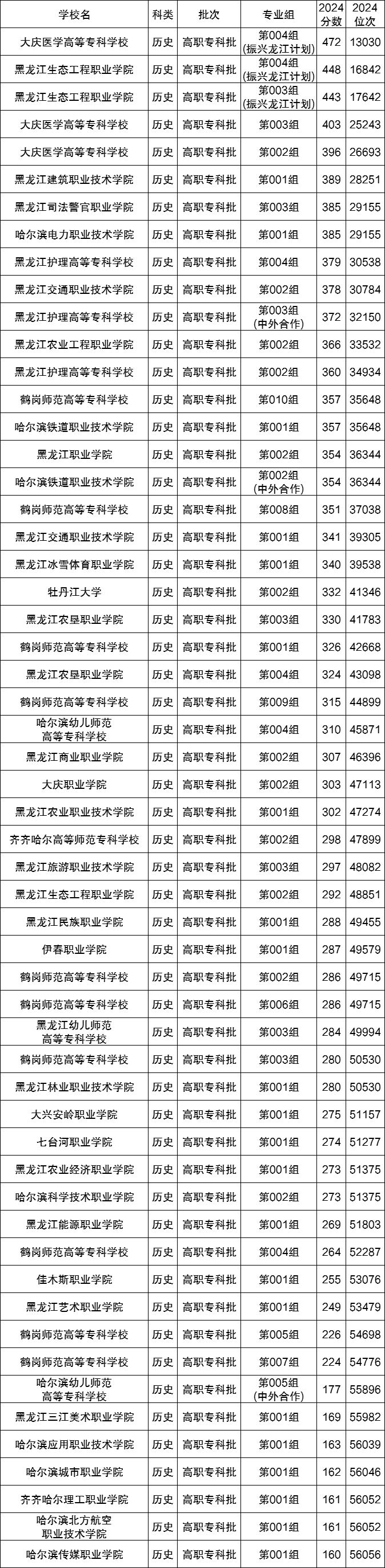 下面是2024年各黑龙江的高职专科院校在黑龙江省历史类的录取分数线(供参考):
