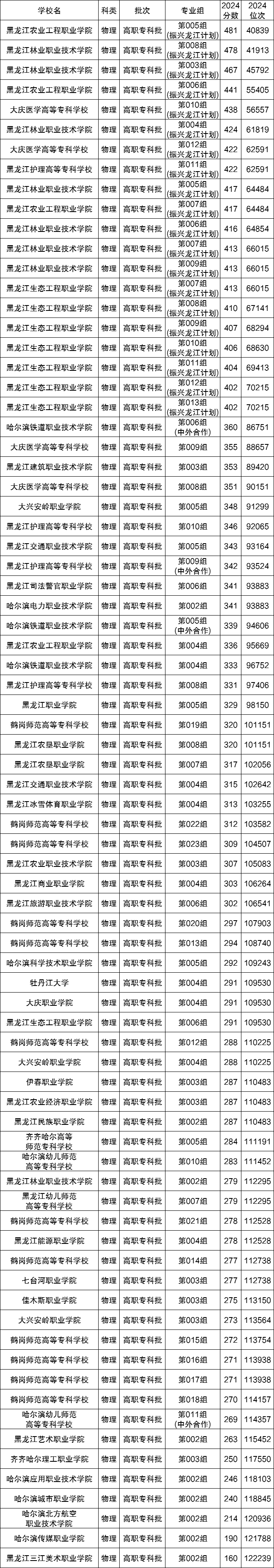 下面是2024年各黑龙江的高职专科院校在黑龙江省物理类的录取分数线