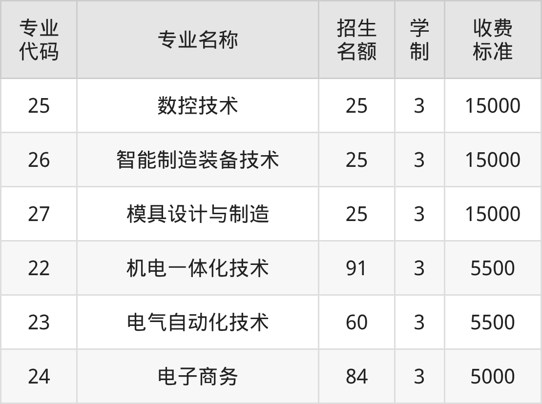 天津中德应用技术大学数控技术专业在专科批招25人,学制3年,专业招生代码是25,学费是15000元一年。天津中德应用技术大学智能制造装备技术专业在专科批招25人,学制3年,专业招生代码是26,学费是15000元一年。