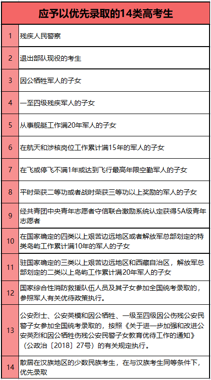 以下考生,参加全国统考录取并达到有关高校投档要求的,在与其他考生同等条件下,应予以优先录取。