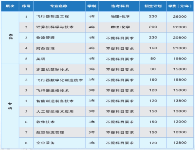 本科专业:英语、飞行器制造工程、计算机科学与技术、财务管理和物流管理。