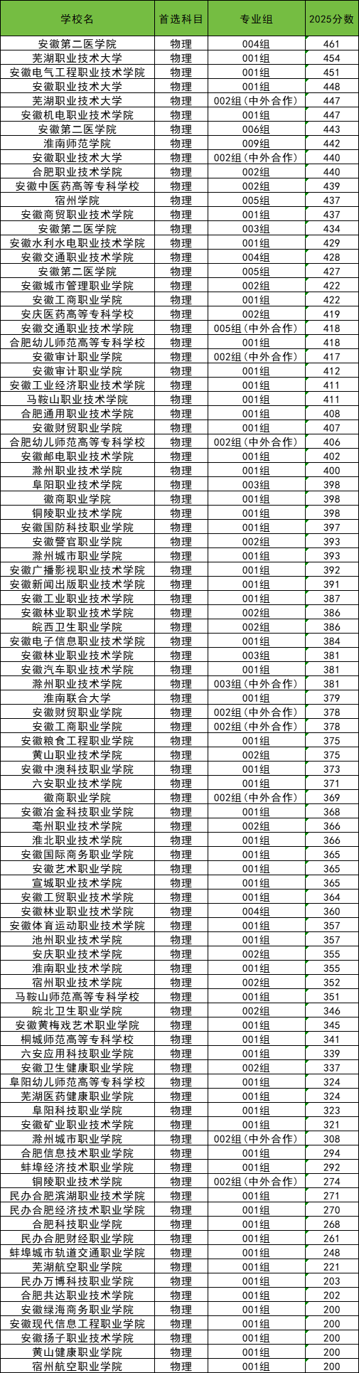 下面是2025年安徽省内专科高校物理类录取分数线一览表: