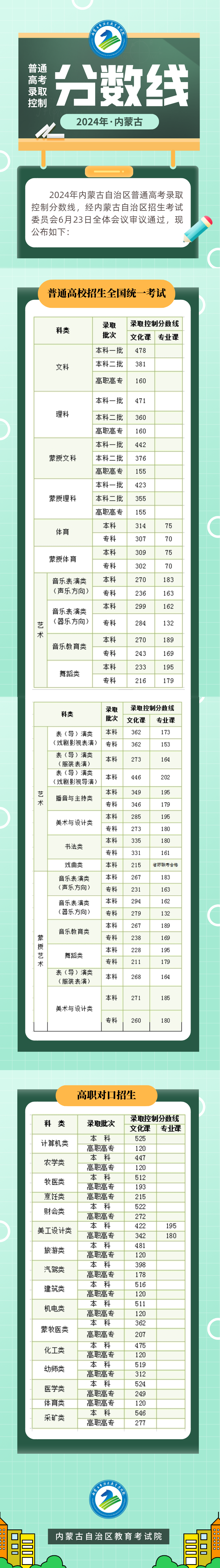 经省招生委员会研究决定,2024年全国普通高等学校招生内蒙古自治区各批次录取最低控制分数线如下: