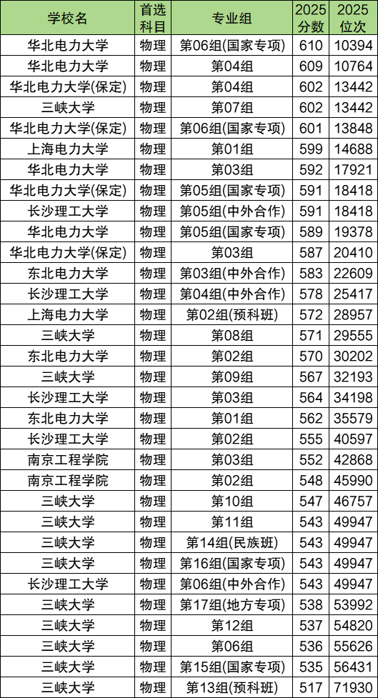 2025年电力大学物理类最低录取分数线是517分,收分最低的学校是三峡大学(第13组),对应最低位次是71930名。