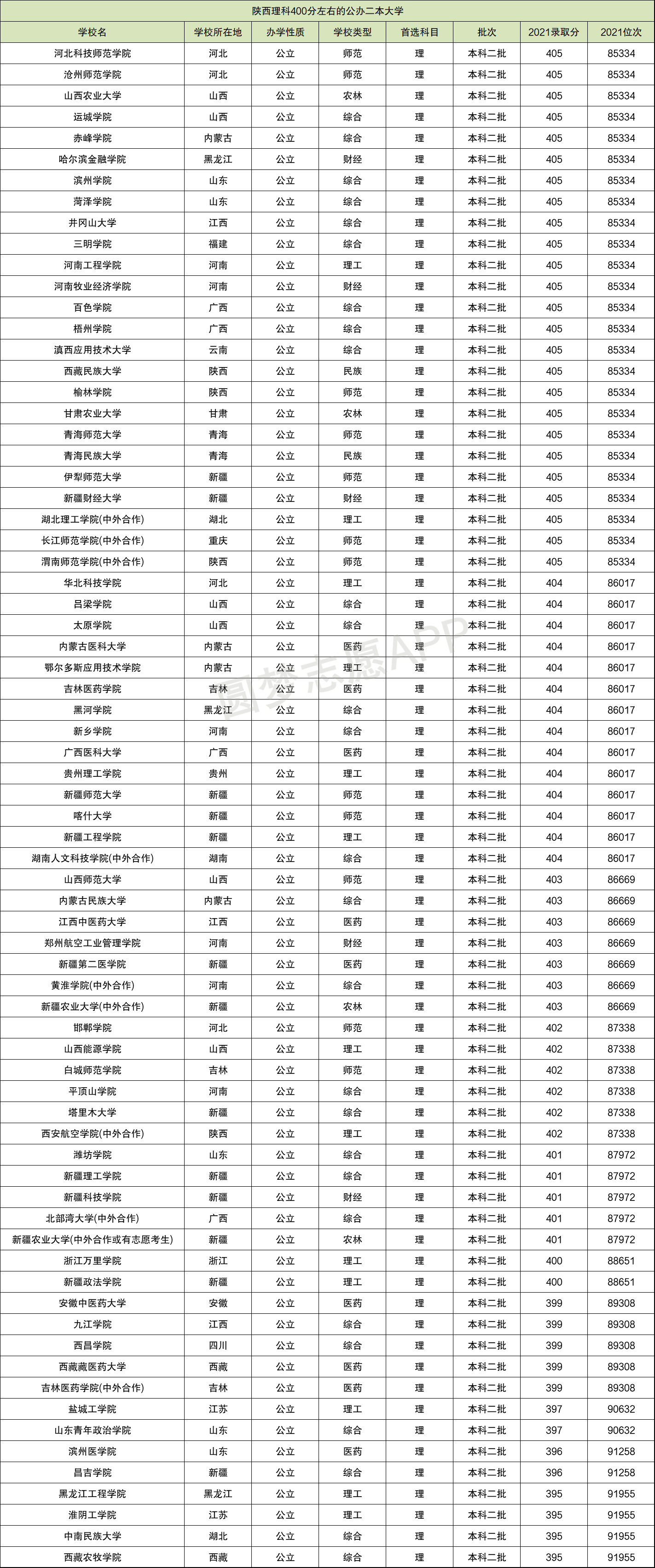 由于目前新高考省份院校已经不分一本二本,所以小编就查看了旧高考省份2021年的批次线,发现只有内蒙古文理科、吉林文理科、黑龙江文理科、河南理科、广西理科、贵州理科、陕西理科、甘肃理科、宁夏理科、新疆文理科有400分左右的二本大学招生,小编就以陕西为例,为大家整理出陕西400分左右的公办二本大学。