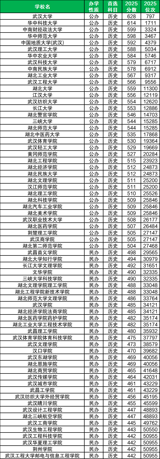以下为2025年湖北省内历史类所有本科大学最低分数线: