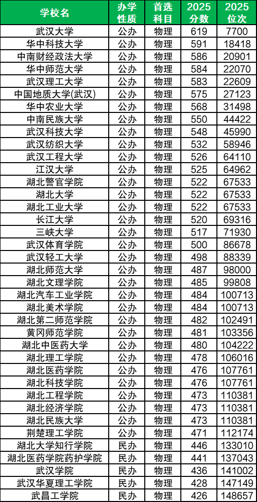 以下为2025年湖北省内物理类所有本科大学最低分数线: