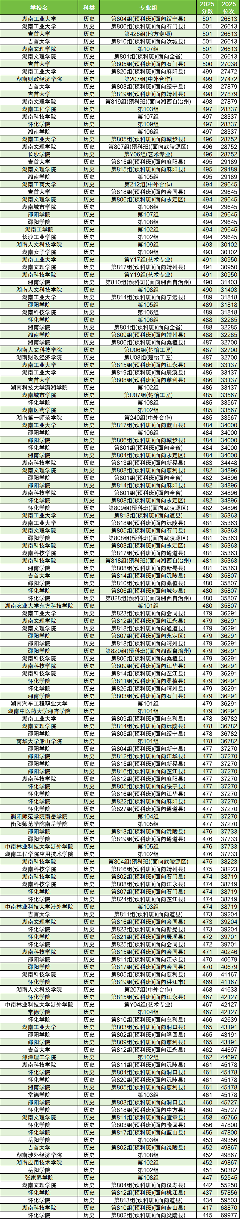 以下为2025年湖南省内历史类所有二本大学分数线(可滑动查看):