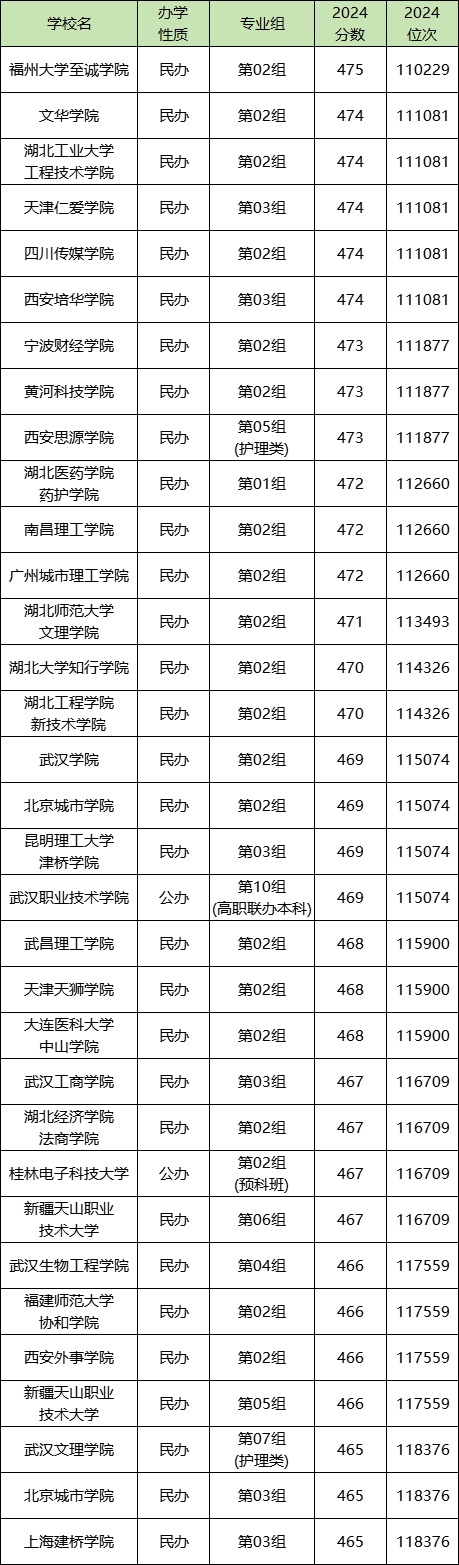 2024年湖北物生政470分左右能上文华学院02组(474分)、武汉学院02组(469分)、上海建桥学院03组(465分)等院校专业组。