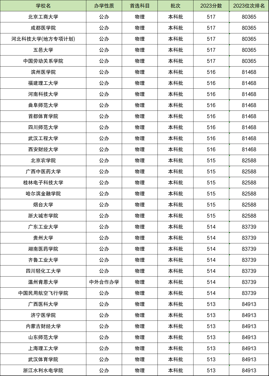 8万-8.5万位中,最低位次对应的大学是浙江水利水电学院、武汉体育学院等7所,最低录取位次为84913位,位次对应分数为513分。