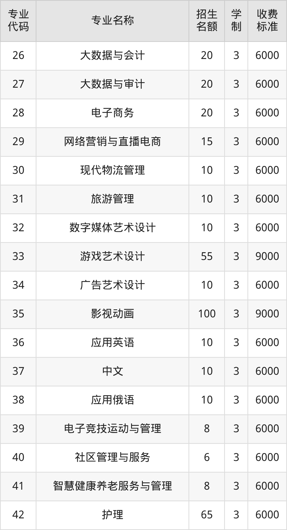 | 专业 代码 | 专业名称 | 招生 名额 | 学 制 | 收费 标准 |